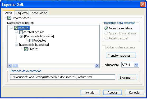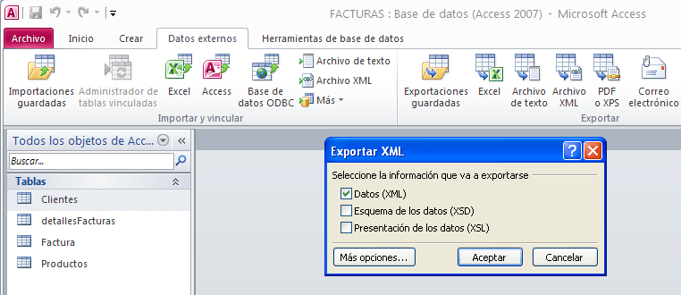 Exporte la tabla Factura a un fichero xml. Exporte exclusivamente los Datos(XML). Incluya en la exportación la tabla Clientes con la que está relacionada.