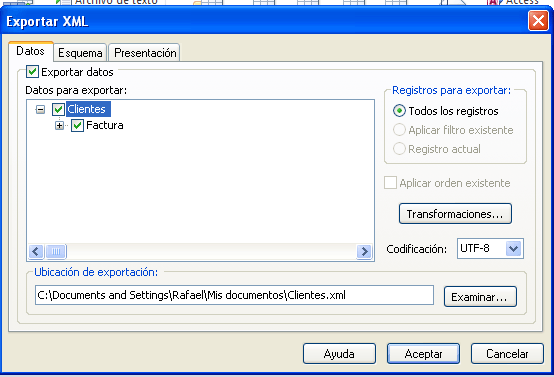 Exporte la tabla Cliente a un fichero xml. Exporte exclusivamente los Datos(XML). Incluya en la exportación la tabla Factura con la que está relacionada.