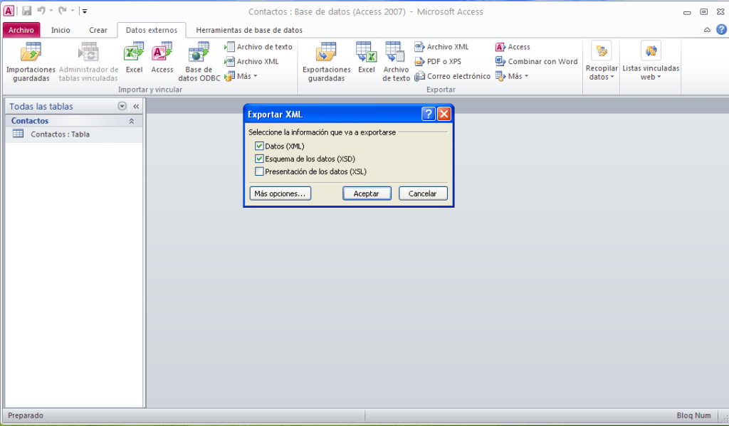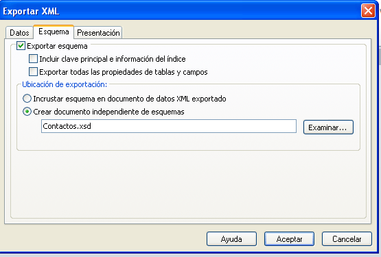 Exporte la tabla Contactos a un fichero xml. Exporte los Datos(XML) y el esquema (XSD). En el xsd no incluya la clave principal ni las propiedades de tablas y campos.