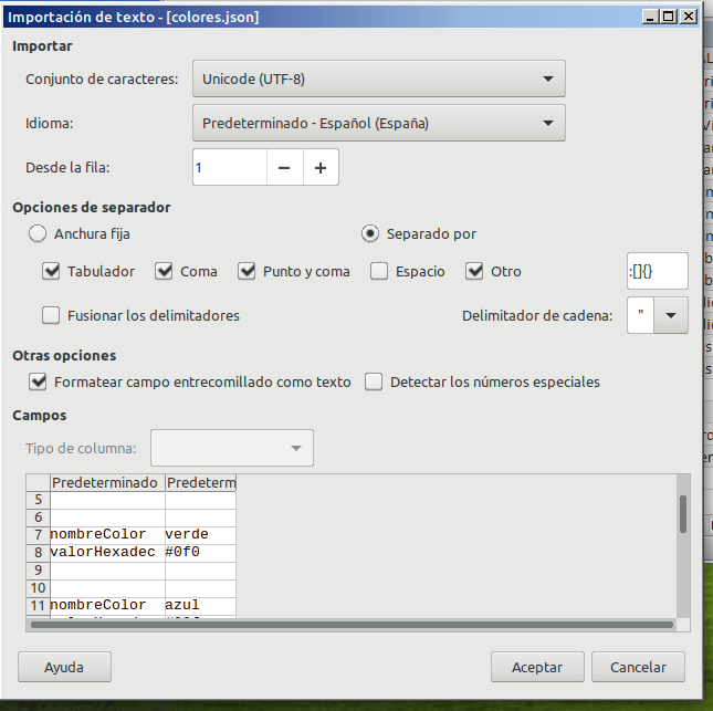 Para que se importe bien tenemos que seleccionar los elementos separadores del .json.