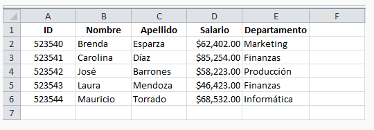 "ID": "523542", "Nombre": "José", "Apellido": "Barrones", "Salario": "$58.223.00", "Departamento": "Producción" }, {