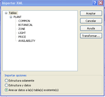 Importe el fichero xml plant_catalog2.xml a Microsoft Access para incorporar a la tabla creada en el apartado 1 la información.