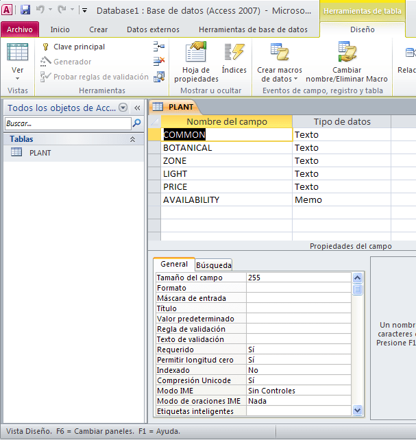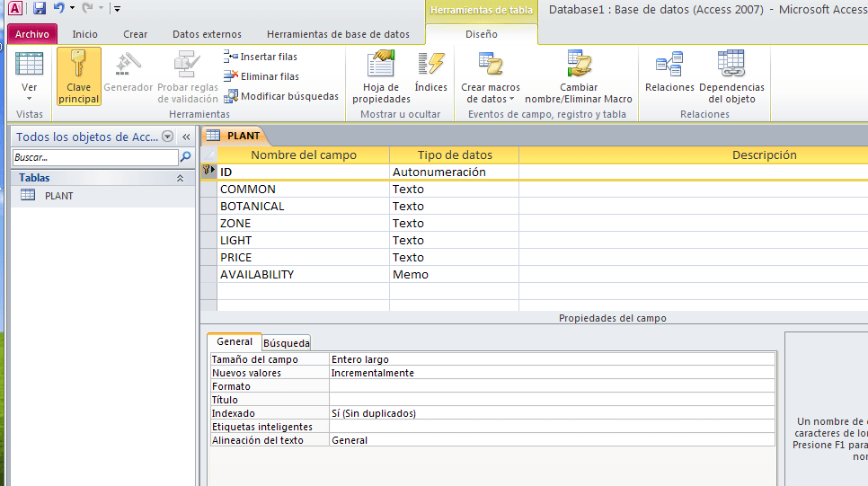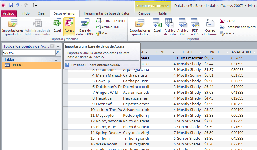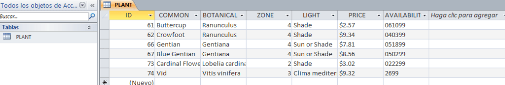 Importe el fichero xml plant_catalog1.xml a Microsoft Access para incorporar a la tabla creada en el apartado 1 la información.